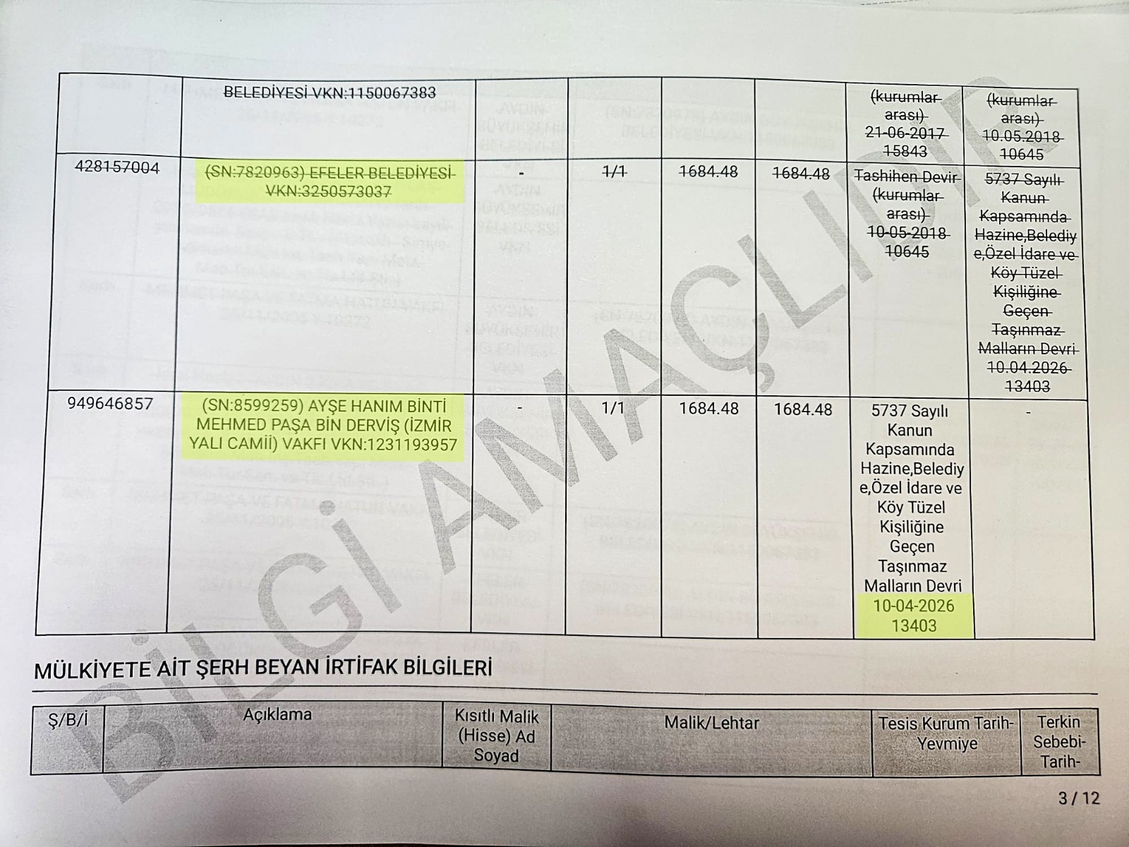 Efeler Belediyesi’nin dolayısıyla Efeler halkının öz malı olan binanın tapusu, belediyeye hiçbir resmi bilgilendirme yapılmadan, kapalı kapılar ardında Ayşe Hanım Binti Mehmed Paşa Bin Derviş Vakfı’na devredildi. Efeler Belediyesi, kendi mülkiyetindeki yerin el değiştirdiğini ise ancak bir haber sitesinden öğrenebildi.