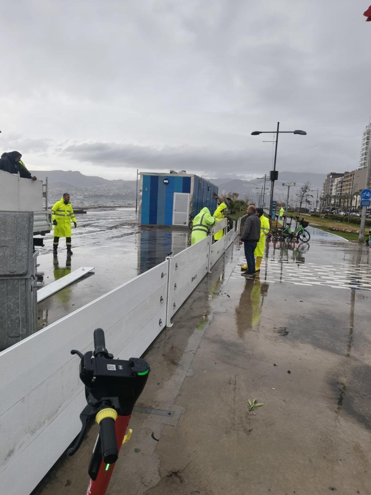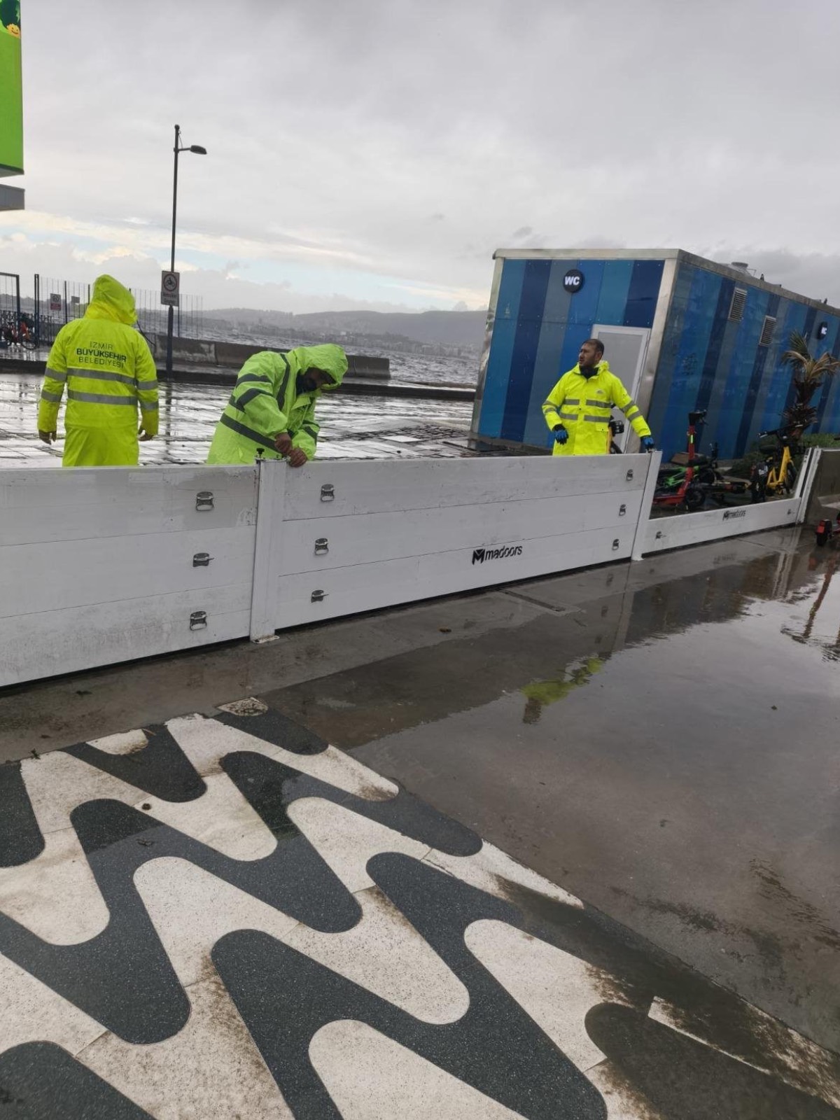İzmir Büyükşehir Belediyesi’nin Kordon’da deniz taşkınlarını önlemek ve İzmirlilerin kıyı şeridini daha konforlu kullanmasını sağlamak amacıyla hayata geçirdiği geçici fırtına duvarı, kenti etkisi altına alan sağanak yağış ve fırtına sırasında deniz taşkınını engelledi. İzmir Büyükşehir Belediyesi Fen İşleri Dairesi Başkanlığı ekipleri, Meteoroloji Genel Müdürlüğü’nün uyarılarının ardından geçici fırtına duvarının kapılarını aktif hale getirerek olası risklere karşı önlem aldı.