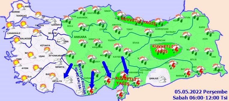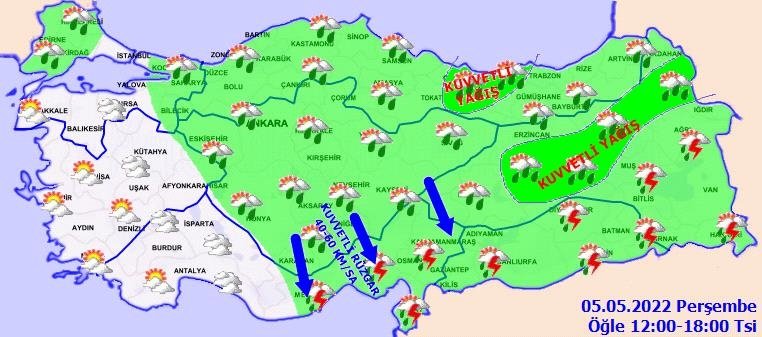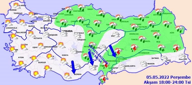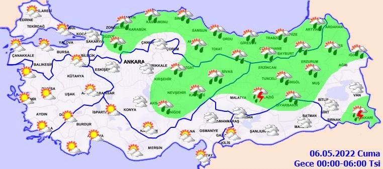 Meteoroloji Genel Müdürlüğü tarafından yapılan son değerlendirmelere göre: Ülkemiz genelinin çok bulutlu, Marmara'nın doğusu, Trakya, Doğu Akdeniz, İç Anadolu, Karadeniz, Doğu ve Güneydoğu Anadolu'nun yağmur ve sağanak, yer yer gök gürültülü sağanak yağışlı geçeceği tahmin ediliyor. Yağışların; Orta Karadeniz kıyıları ile Adana'nın doğusu, Osmaniye, Hatay, Giresun, Trabzon, Erzurum, Kars, Tunceli, Bingöl ve Elazığ çevrelerinde yerel olmak üzere kuvvetli olması bekleniyor.