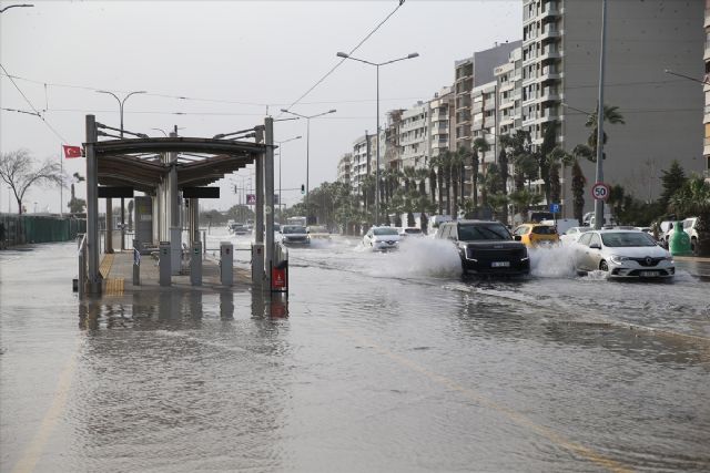 İzmir'in Karşıyaka ve Konak ilçelerinde kuvvetli fırtına denizin taşmasına neden olurken, yollar su altında kaldı.