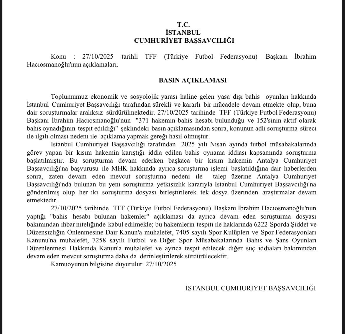 İstanbul Cumhuriyet Başsavcılığı'ndan hakemlerin bahis skandalına ilişkin açıklama geldi. Dosyanın, hakemlerin MHK için yaptığı soruşturma ile birleştirileceği aktarılan açıklamada şu ifadelere yer verildi: