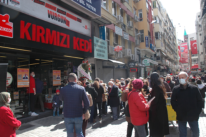 Kitabevi önünde uzun kuyruklar oluşurken, CHP İzmir İl Başkanı Deniz Yücel ve ilçe belediye başkanları da etkinlikte yer aldı.