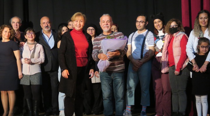 Foça Belediyesi Meclis Üyesi Mukaddes Yarba, Reha Midilli Kültür Merkezinde sahnelenen oyunun sonunda Yönetmen Erdal Dinçer’e ve Foça Belediye Tiyatrosuna teşekkür çiçeği sundu.