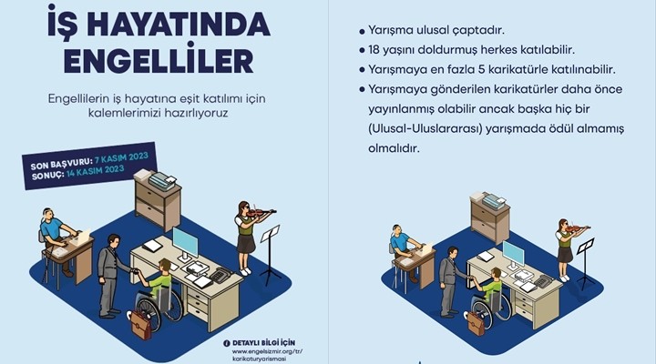 Engellilerin sorunlarına çözüm üretmek amacıyla bir dizi çalışma yürüten İzmir Büyükşehir Belediyesi, 1-3 Aralık tarihlerinde düzenleyeceği “4. Uluslararası Engelsizmir Kongresi” kapsamında ulusal karikatür yarışması düzenliyor. “İş Hayatındaki Engelliler” konulu yarışmaya 18 yaşını doldurmuş kişiler en fazla 5 karikatür ile katılabilecek. Karikatürlerin 7 Kasım 2023 tarihine kadar [email protected] adresine iletilmesi gerekiyor. Yarışmanın sonuçları ise 14 Kasım’da duyurulacak.