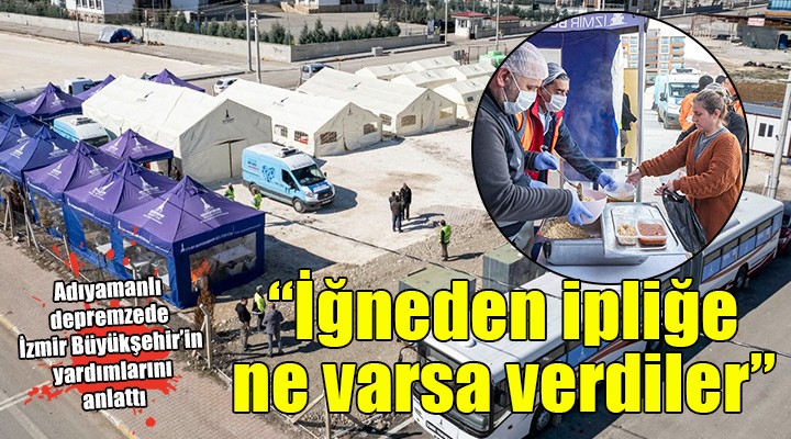 İzmir Büyükşehir Belediyesi’nin koordinasyon birimi için gönüllü olarak yer tahsis eden ve merkezde kalarak destek olan 60 yaşındaki Adıyamanlı depremzede Hasan Yavuz, yardımları için İzmir Büyükşehir Belediyesi’ne teşekkür etti. Yavuz, “Depremden sonra buraya ilk İzmir Büyükşehir Belediyesi geldi. Bizden yer istediler, ben de yerimi onlara verdim. Burada sıcak yemek dağıtıyorlar. Köylere götürüyorlar. Allah İzmir Büyükşehir Belediye Başkanı Tunç Soyer’den, çalışanlarından razı olsun. Bütün ihtiyaçlarımızı karşılıyorlar. Belediye gelmeden önce burası bir kabus yeriydi, korkuyorduk. Onlar geldikten sonra biraz canlandık. Çadır verdiler, odun verdiler, iğneden ipliğe ne varsa verdiler. Dağ köylerine kadar yardım götürüyorlar” ifadelerini kullandı.