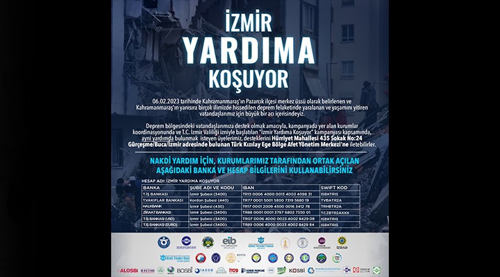 İzmir Ticaret Odası, Ege Bölgesi Sanayi Odası, İzmir Ticaret Borsası, Ege İhracatçı Birlikleri, İzmir Esnaf ve Sanatkarlar Odaları Birliği, Deniz Ticaret Odası İzmir Şubesi, Ege Genç İş İnsanları Derneği, Ege Sanayicileri ve İş İnsanları Derneği, İzmir Sanayiciler ve İş İnsanları Derneği, il sınırı içerisinde bulunan organize sanayi bölgeleri, İMEAK Deniz Ticaret Odası Aliağa Şubesi, Aliağa Ticaret Odası, Bayındır Ticaret Odası, Bergama Ticaret Odası, Menemen Ticaret Odası, Ödemiş Ticaret Odası, Ödemiş Ticaret Borsası, Selçuk Ticaret Odası, Tire Ticaret Odası ve Torbalı Ticaret Odası deprem bölgesindeki vatandaşlara destek olmak amacıyla “İzmir Yardıma Koşuyor” kampanyasını başlattı.