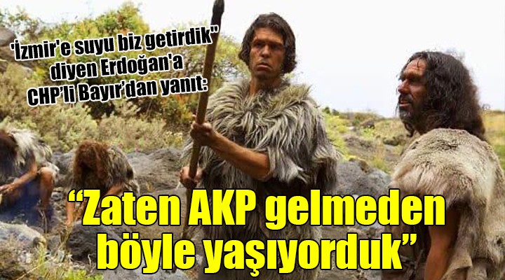 Sosyal medya hesabından insanlığın ilk dönemlerini anlatan bir görsel paylaşan Bayır, "Erdoğan; "İzmir'e suyu biz getirdik" demiş. Tabi, suyu da siz getirdiniz. Zaten, AKP iktidara gelmeden önce biz de bu şekilde yaşıyorduk. İzmir'imizin, kredi notu AAA. Peki, sarayın kredi notu kaç, partili Cumhurbaşkanı?" ifadelerini kullandı.