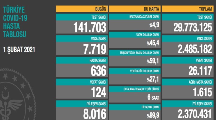 Sağlık Bakanlığı'nca duyurulan 'Türkiye Covid-19 Hasta Tablosu'na göre; son 24 saatte yapılan 141 bin 703 testte 7 bin 719 vaka, 636 hasta tespit edildi. Virüs nedeniyle 124 kişi hayatını kaybederken, 8 bin 16 kişi de iyileşti. Bugünkü verilerle toplam test sayısı 29 milyon 773 bin 125 toplam vaka sayısı 2 milyon 485 bin 182, toplam vefat sayısı 26 bin 117, toplam ağır hasta sayısı 1615, toplam iyileşen hasta sayısı 2 milyon 370 bin 431 oldu.