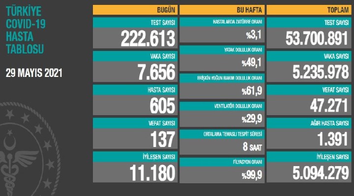 Bakanlığın açıkladığı verilere göre; bugüne kadar yapılan toplam test sayısı 53 milyon 700 bin 891, toplam vaka sayısı 5 milyon 235 bin 978, iyileşen toplam hasta sayısı 5 milyon 94 bin 279'a ulaştı.