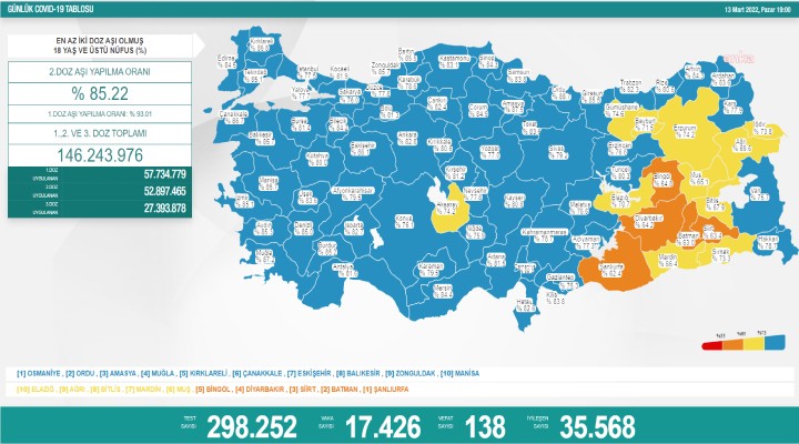 Sağlık Bakanlığı’nın 13 Mart’a ilişkin koronavirüs verilerine göre; son 24 saat içerisinde yapılan 298 bin 252 testten 17 bin 426’sı pozitif çıktı. Virüs nedeniyle 138 kişi daha hayatını kaybetti. İyileşen hasta sayısı 35 bin 568 olarak açıklandı.