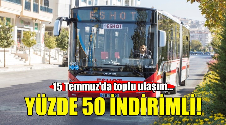 İzmir Büyükşehir Belediyesi’ne bağlı ESHOT, İZULAŞ, İZTAŞIT, İZDENİZ, İzmir Metrosu ve İzmir Tramvayı’nda 15 Temmuz Demokrasi ve Milli Birlik Günü’nde yüzde 50 indirimli ulaşım sağlanacak.