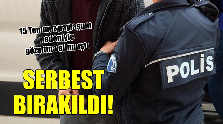 Fetullahçı Terör Örgütü'nün 15 Temmuz 2016'daki darbe girişimine karşı yürütülen mücadeleyle ilgili hakaret içerikli paylaşım yaptığı gerekçesiyle Ş.Y., önceki gün gözaltına alındı. Polisteki işlemlerin ardından bugün adliyeye sevk edilen Ş.Y, adli kontrol şartıyla serbest bırakıldı. İçişleri Bakanı Süleyman Soylu, geçen 15 Temmuz’da sosyal medyadan yaptığı açıklamada, “15 Temmuz destanına küfreden şeref yoksunu alçak, İzmir polisimiz tarafından gözaltına alındı" ifadelerini kullanmıştı.