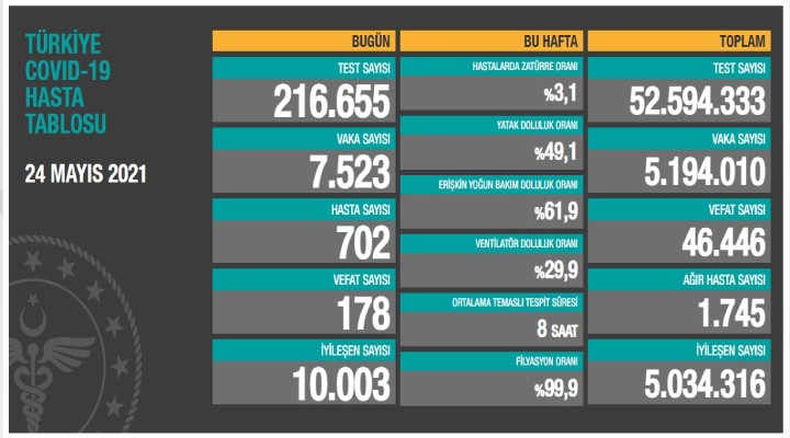 Sağlık Bakanlığı'nca duyurulan 'Türkiye Covid- 19 Hasta Tablosu'na göre; son 24 saatte yapılan 216 bin 655 testte, 7 bin 523 vaka, 702 hasta tespit edildi. Virüs nedeniyle 178 kişi hayatını kaybederken, 10 bin 3 kişi iyileşti. Bugünkü verilerle toplam test sayısı 52 milyon 594 bin 333, toplam vaka sayısı 5 milyon 194 bin 10, toplam vefat sayısı 46 bin 446, toplam ağır hasta sayısı 1745, toplam iyileşen sayısı ise 5 milyon 34 bin 316 oldu. Tabloda haftalık oranlar ise hastalarda zatürre oranı yüzde 3,1, yatak doluluk oranı yüzde 49,1, erişkin yoğun bakım doluluk oranı yüzde 61,9, solunum cihazına bağlı (ventilatör) doluluk oranı yüzde 29,9, ortalama temaslı tespit süresi 8 saat, filyasyon oranı yüzde 99,9 şeklinde yer aldı.