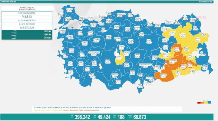Sağlık Bakanlığı'nın paylaştığı haritada, 2. doz aşılamada hedef nüfusun yüzde 75 ve üzerinin aşılandığı iller mavi renkle gösteriliyor. Sağlık Bakanlığı'nın koronavirüs verilerine ilişkin yayınladığı tabloda yer alan bilgilere göre; 2. doz aşılamada yüzde 89.2 aşılama oranıyla Osmaniye birinci sırada yer alıyor. Yüzde 62.3 aşılama oranı ile Şanlıurfa ise son sırada bulunuyor. 2. doz aşılamada üç büyük ilde ise birinci sırada yüzde 85.1 ile İzmir, ikinci sırada yüzde 82.7 ile Ankara ve üçüncü sırada yüzde 77.5 ile İstanbul yer alıyor.