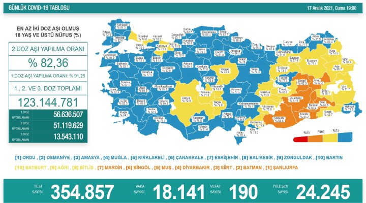 18 yaş ve üzeri nüfusun aşılanması verilerinde 1'inci doz Türkiye ortalaması yüzde 91,25, 2'nci doz ortalaması yüzde 82,36 olarak ölçüldü. Ayrıca, 1'inci dozda 56 milyon 636 bin 507, 2'nci dozda 51 milyon 119 bin 629 ve 3'üncü dozda 13 milyon 543 bin 110 olmak üzere toplam 123 milyon 144 bin 781 aşı uygulandı.