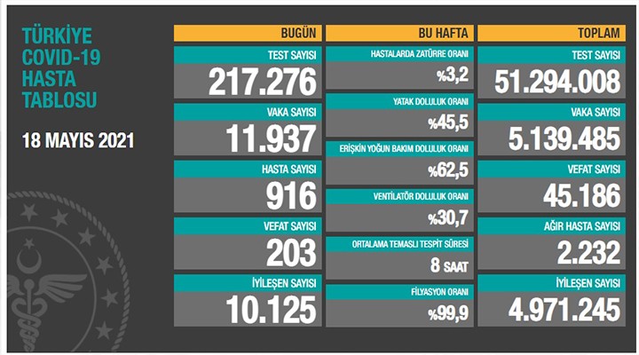 Bugüne kadar yapılan toplam test sayısı 51 milyon 294 bin 8, toplam vaka sayısı 5 milyon 139 bin 485, iyileşen toplam hasta sayısı 4 milyon 971 bin 245'e ulaştı.