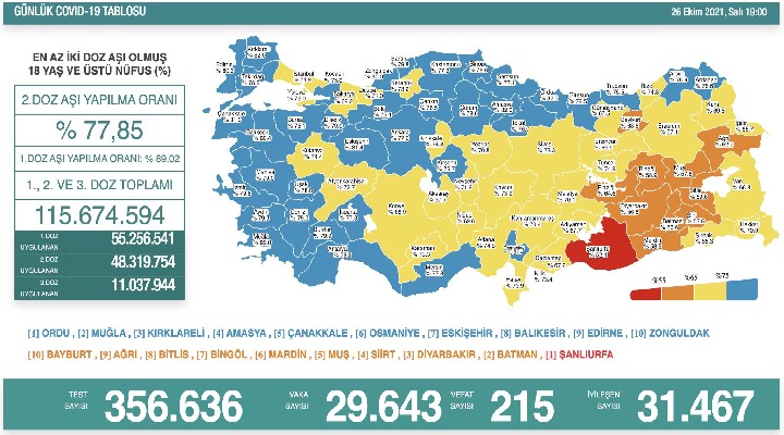 En az 2 doz aşı olmuş kişi oranının en yüksek olduğu iller; Ordu, Muğla, Kırklareli, Amasya, Çanakkale, Osmaniye, Eskişehir, Balıkesir, Edirne ve Zonguldak olurken, 2 doz aşı olmuş kişi oranının en az olduğu iller ise Şanlıurfa, Batman, Diyarbakır, Siirt, Muş, Mardin, Bingöl, Bitlis, Ağrı ve Bayburt oldu.