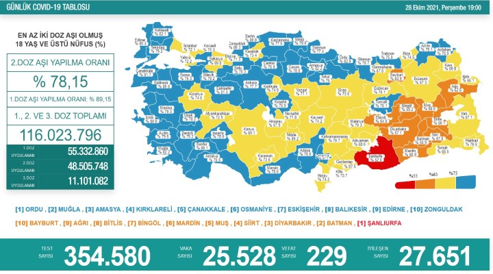25.528 test pozitif çıktı. Hastalığı ağır geçirenlerden 229 kişi hayatını kaybetti. İkinci doz aşı oranı yüzde 75’in altında olan 42 ilimizde aşılanma düşük hızla ilerliyor. Aşının riski azalttığını biliyoruz. Aşınızı bir an önce yaptırın. SİZE DEĞER VERENLER ADINA, LÜTFEN.