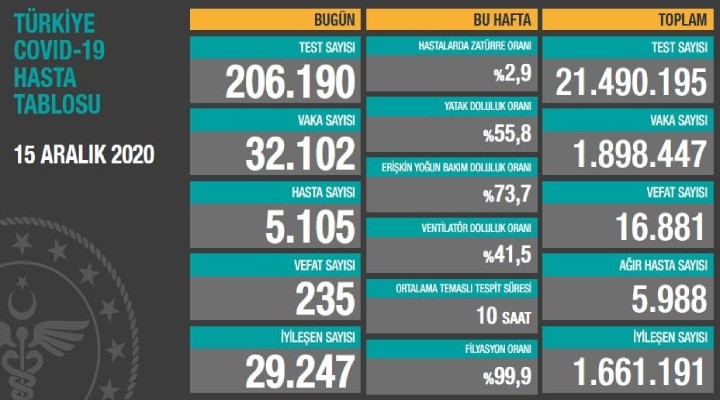 Sağlık Bakanı Fahrettin Koca, son 24 saatte 235 kişinin koronavirüs nedeniyle hayatını kaybettiğini açıkladı. Bugün toplam 206 bin 190 test yapılırken, can kaybı 16 bin 881’e yükseldi. Semptom gösteren 5 bin 105 kişiyle birlikte toplam 32 bin 102 yeni vaka tespit edildi. Türkiyede toplam vaka sayısı 1 milyon 898 bin 447 oldu. Bugün iyileşen 29 bin 247 kişiyle birlikte toplam iyileşen hasta sayısı 1 milyon 661 bin 191’e yükseldi. Toplam hastalarda zatürre oranının yüzde 2.9, toplam ağır hasta sayısının ise 5 bin 988 olduğu açıklandı. Türkiye genelinde yatak doluluk oranı yüzde 55.8, erişkin yoğun bakım doluluk oranı yüzde 73.7 ve ventilatör doluluk oranı yüzde 41.5 olarak duyuruldu.