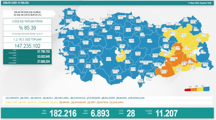 Sağlık Bakanlığı'nın açıkladığı 'Günlük Kovid- 19 Tablosu' verilerine göre; son 24 saatte yapılan 182 bin 216 testte 6 bin 893 vaka tespit edildi. Koronavirüs nedeniyle 28 kişi hayatını kaybederken, 11 bin 207 kişinin de tedavisi ve karantinası sona erdi. 18 yaş ve üzeri nüfusun aşılanması verilerinde 1'inci doz Türkiye ortalaması yüzde 93,11, 2'nci doz ortalaması yüzde 85,39 olarak belirlendi. Ayrıca 1'inci dozda 57 milyon 796 bin 702, 2'nci dozda 53 milyon 2 bin 640 ve 3'üncü dozda 27 milyon 689 bin 204 olmak üzere 147 milyon 235 bin 102 aşı uygulandı.