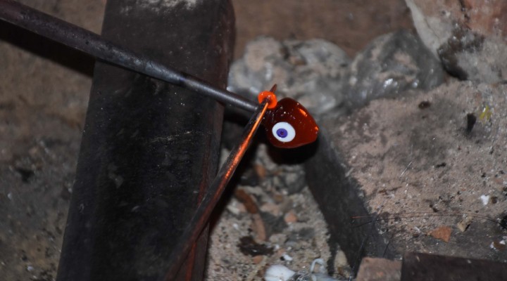 Doğup büyüdüğü Nazarköy'de ata yadigarı mesleğini 3'üncü kuşak olarak devam ettiren Uğur Karataş (39), "Babam, dedem, eniştem, dayım, abim bütün aile fertlerim bu işi yaptı. Çocukluğumuzda oyun oynarken boncuk yapıyormuş gibi oynuyorduk. Babam, dedem, abilerim çalışırken üretim anında ocağa gelirdik. Eskiden nazar boncuklarını şişe camlarından geri dönüşümle yaparlardı. Biz şişeleri temizlerdik. 11 yaşında bu mesleğe başladım. 'Saraç' denilen gözsüz yuvarlak boncukları yapmaya başladım. Rahmetli eniştem göz takmasını öğretti, kalıp vurmasını dayım gösterdi. Her bir büyüğüm, ustam bana bir teknik gösterdi" diye konuştu.