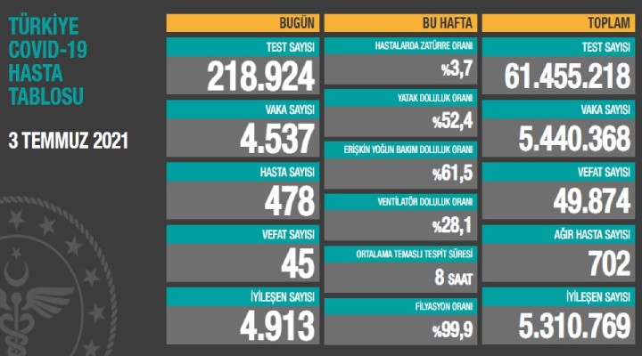 Sağlık Bakanlığı'nca duyurulan 'Türkiye Covid- 19 Hasta Tablosu'na göre; son 24 saatte yapılan 218 bin 924 testte 4 bin 537 vaka, 478 hasta tespit edildi. Virüs nedeniyle 45 kişi hayatını kaybederken, 4 bin 913 kişinin de tedavisi ve karantinası sona erdi. Bugünkü verilerle toplam test sayısı 61 milyon 455 bin 218, toplam vaka sayısı 5 milyon 440 bin 368, toplam vefat sayısı 49 bin 874, toplam ağır hasta sayısı 702, toplam iyileşen sayısı ise 5 milyon 310 bin 769 oldu.