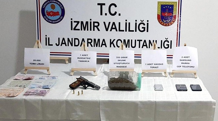 İzmir Jandarma Komutanlığı ekipleri, Mersinalanı Mahallesi'nde yaşayan G.S.'nin uyuşturucu ve ruhsatsız tabanca sattığı bilgisi üzerine harekete geçti. G.S.’nin adresine baskın yapan ekipler, narkotik köpek 'Varlı' ile yaptıkları aramada; 1 kilo 600 gram esrar, 1 ruhsatsız tabanca, 1 hassas terazi ile uyuşturucu satışından kazanıldığı değerlendirilen 20 bin TL ele geçirdi. Gözaltına alınarak adliyeye sevk edilen G.S.’nin 'ruhatsız ateşli silahlarla mermileri satın alma, taşıma veya bulundurmak' da dahil 6 farklı suçtan arama kararı bulunduğu belirlendi.