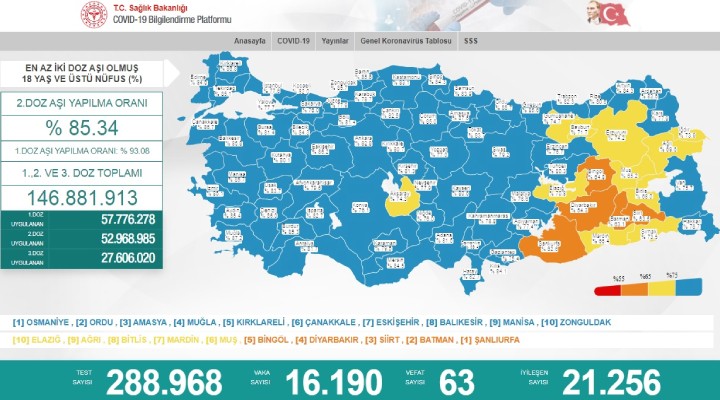 Sağlık Bakanlığı'nın açıkladığı 'Günlük Kovid- 19 Tablosu' verilerine göre; son 24 saatte yapılan 288 bin 968 testte 16 bin 190 vaka tespit edildi. Koronavirüs nedeniyle 63 kişi hayatını kaybederken, 21 bin 256 kişinin de tedavisi ve karantinası sona erdi. 18 yaş ve üzeri nüfusun aşılanması verilerinde 1'inci doz Türkiye ortalaması yüzde 93,08, 2'nci doz ortalaması yüzde 85,34 olarak belirlendi. Ayrıca 1'inci dozda 57 milyon 776 bin 278, 2'nci dozda 52 milyon 968 bin 985 ve 3'üncü dozda 27 milyon 606 bin 20 olmak üzere 146 milyon 881 bin 913 aşı uygulandı.