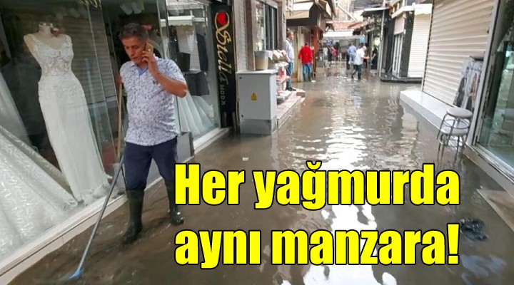 Kemeraltı Çarşısının esnaflarından Hayrettin Ertaş (37), her yağmurda dükkanında nöbet tutmak zorunda kaldığını hatırlattı. Ertaş, bölge esnafının yağmur çizmesi bulundurduğunu belirterek, "2000 yılından beri Kemeraltı'ndayım. Geldiğim günden bugüne kadar Kemeraltı'nın altyapı sorunu çözülmedi. Her yağmur yağdığında esnaf kapıda, çizmelerini giyip elinde süpürge, kürek ve kova ile nöbet tutuyor. Yağmur yağdığında Kemeraltı boşalıyor. Esnaf sadece dükkanında nöbet tutuyor" diye konuştu.