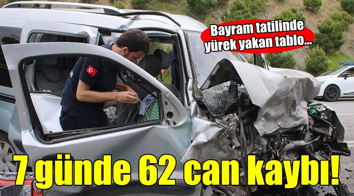 Bayram tatilinin ilk 7 gününde (Cumartesi, Pazar, Pazartesi, Salı, Çarşamba, Perşembe ve Cuma) 62 kişi hayatını kaybetti.