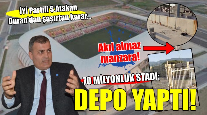 Başkan Duran, İzmir Büyükşehir Belediyesi ve Tire Belediyesi işbirliğinde 70 milyon TL maliyetle tamamlanıp 2018'de hizmete açılan, şimdiki değeri milyarlarla ölçülen stadı, depo olarak kullanmaya başladı. Belediyenin parke taşları ile çeşitli malzemeleri stadın protokol girişindeki alana yığıldı. Stat içerisinde amatör branşlar için ayrılan bölümlere de Tire Üretim ve Pazarlama Kooperatifi'ne ait zeytinyağı ve çeşitli ürünlerin depolandığı öne sürüldü.