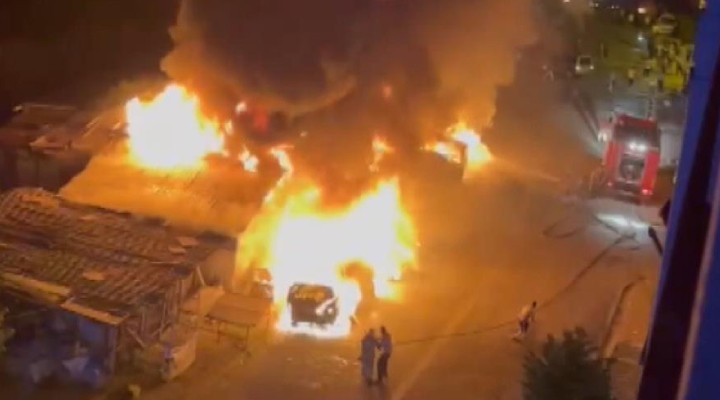 Park halindeki araçlarda başlayan yangın kısa sürede büyüyerek yakındaki iş yerine sıçradı.