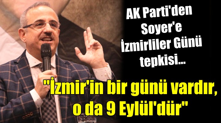 SONKALEİZMİR-İzmir Büyükşehir Belediye Başkanı Tunç Soyer'in bugünü Dünya İzmirliler Günü olarak ilan etmesine AK Parti'den sert tepki geldi. AK Parti İzmir İl Başkanı Kerem Ali Sürekli, sosyal medya hesabından 5 maddelik bir açıklama ile Soyer'e yüklendi. Sürekli, İzmirliler'in gününün 9 Eylül olduğuna vurgu yaptı.