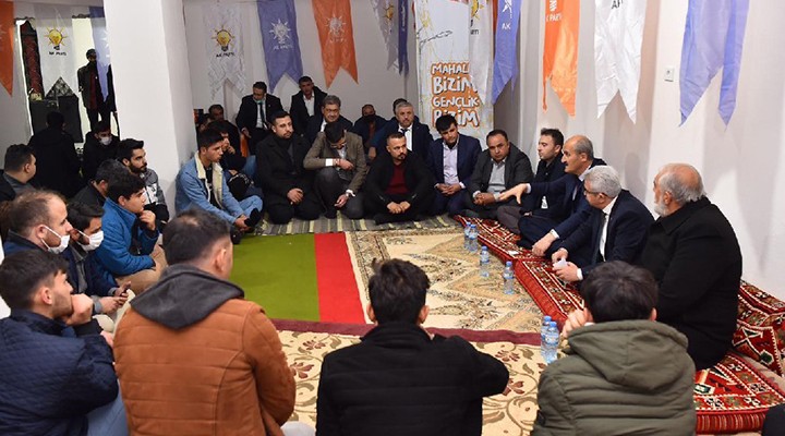 AK Parti Bayrakları ve “Mahalle Bizim Gençlik Bizim” flamalarıyla süslenen camideki etkinliğe katılanlar yerde oturdu.