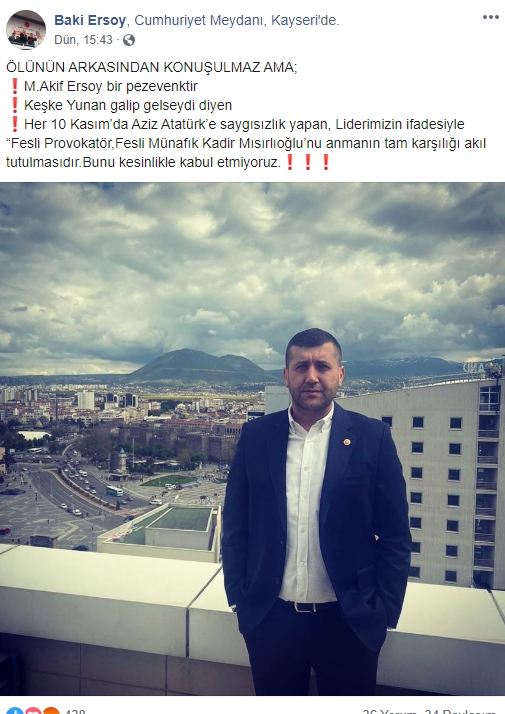 MHP Kayseri Milletvekili Baki Ersoy, sosyal medya hesabından yaptığı paylaşımda, Kadir Mısıroğlu'nu anmanın akıl tutulması olduğunu dile getirdi.