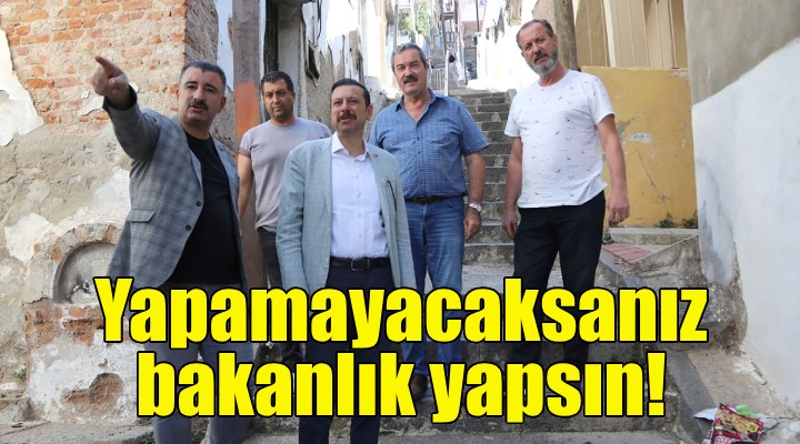"Adında halk bulunan bir partinin halkın sorunlarına bakışı ortada. 12 yıldır bölgede kentsel dönüşüm adına yaptıkları tek şey, 30 metrekarelik bir iletişim ofisi açıp maket sergilemek. 12 yıldır buraya çivi çakmayanlar tam bir aymazlık içindedir ve İzmirlilerin aklıyla alay etmektedir. Eğer yapamayacaklarsa da çıksınlar yapamayacaklarını açıklasınlar, biz de hemşerilerimizin mağduriyetini giderecek başka formüllerin üzerinde çalışalım. Yapamayacaksanız devredin, Bakanlık yapsın. Artık oyalama zamanı bitti, bu işin peşini bırakmayacağız."