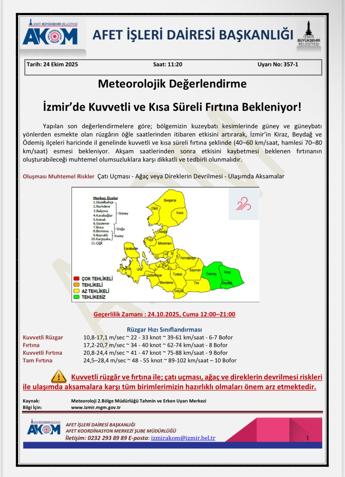 İzmir Büyükşehir Belediyesi Afet Koordinasyon Merkezi (AKOM), Meteoroloji Genel Müdürlüğü verilerine dayanarak kent genelinde kuvvetli ve kısa süreli fırtına beklendiğini duyurdu. Yapılan meteorolojik değerlendirmeye göre, 24 Ekim Cuma günü öğle saatlerinden itibaren İzmir’in kuzeybatı kesimlerinde etkisini artırması beklenen rüzgarın, 40–60 km/saat hızında ve yer yer 70–80 km/saat hamlelerle eseceği tahmin ediliyor.