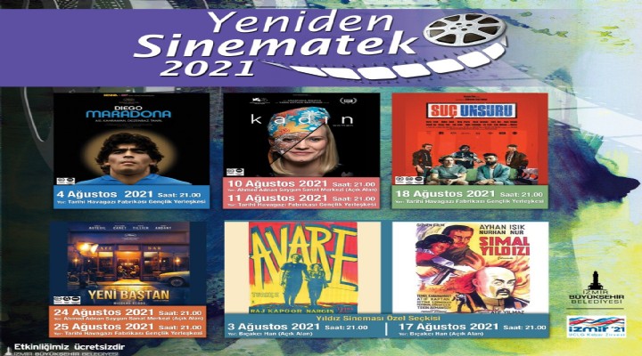 İzmir Büyükşehir Belediyesi’nin “Yeniden Sinematek” gösterimleri, Tarihi Havagazı Fabrikası Gençlik Yerleşkesi’ndeki çim alanda, Ahmed Adnan Saygun Sanat Merkezi’nin bahçesinde (AASSM) ve Bıçakçı Han açık alanda Ağustos ayında da izleyiciyle buluşmaya devam ediyor. Ücretsiz olarak sinemaseverlerle buluşan tüm filmlerin başlama saati 21.00.