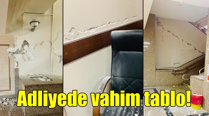 SONKALEİZMİR- İzmir'de büyük yıkıma neden olan depremin ardından birçok kamu binasından da vahim görüntüler ortaya çıkıyor. Bunlardan biri de depremin en büyük tahribatı yarattığı Bayraklı'da yer alan İzmir Adliye Sarayı oldu. Pandemi nedeniyle kısıtlı kapasiteyle çalışan İzmir Adliyesi'nde birçok duvarın depremde hasar aldığı, hem duvarda hem kolonlarda derin çatlaklar oluştuğu, sıvaların döküldüğü, duruşma salonlarındaki masa ve sandalyelerin yerlere savrulduğu, arşivlerdeki dava dosyalarının ortalığı saçıldığı görüldü. Adliye Sarayının içinden çekilen görüntüler şok etkisi yarattı.