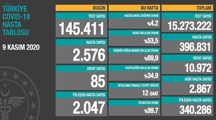 Sağlık Bakanlığı, Türkiye’nin COVID-19 hasta tablosunu açıkladı. 9 Kasım Pazartesi gününün verilerine göre bugün yapılan 145 bin 411 testle birlikte toplam test sayısı 15 milyon 273 bin 222’ye ulaştı. Son 24 saatte 2 bin 576 yeni hasta tespit edildi, toplam hasta sayısı 396 bin 831’e çıktı. Can kaybı da 85 artarak 10 bin 972’ye yükseldi.
