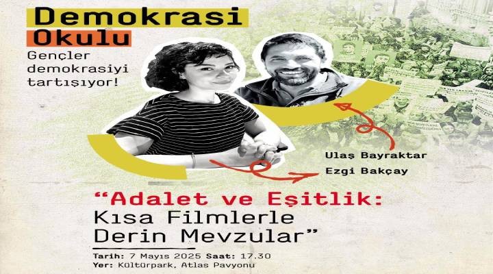 Demokrasi Okulu’nun ilk dersi akademisyen Ulaş Bayraktar ve Ezgi Bakçay tarafından 7 Mayıs 2025 Çarşamba 17.30-20.00 arasında Kültürpark Atlas Pavyonu’nda verilecek. Dersin konusu "Adalet ve Eşitlik: Kısa Filmlerle Derin Mevzular” olacak.