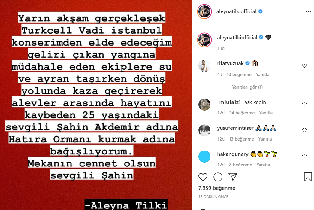 Tilki, sosyal medya hesabından yaptığı açıklamada, "Yarın akşam gerçekleşecek Turkcell Vadi İstanbul konserimden glde edeceğim geliri çıkan yangına müdahale eden ekiplere su ve ayran taşırken dönüş yolunda kaza geçirerek alevler arasında hayatını kaybeden 25 yaşındaki sevgili Şahin Akdemir adına Hatıra Ormanı kurmak adına bağışlıyorum. Mekanın cennet olsun sevgili Şahin" diye yazdı.