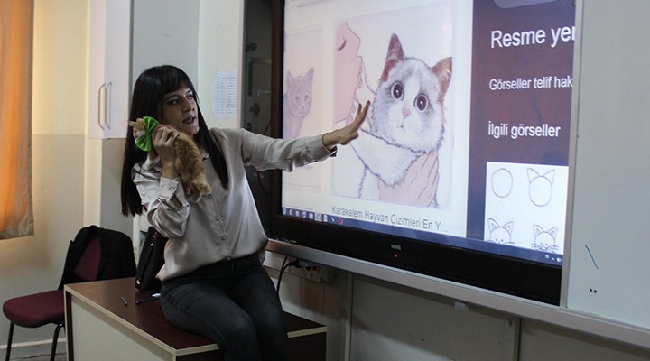 Karabağlar'daki İlkkurşun Ortaokulu'nda resim öğretmenliği yapan Şeyda Yılmaz, daha önce hayvanlarla ilgili projeler hazırlayıp, sokak kedileri için damacanalardan mama kabı ve kulübeler yaptı. Kızının eve kedi almak istemesiyle hayvan sevgisi artan Yılmaz, şimdi de öğrencilerinin sokakta bulduğu kedileri sınıfa getirmesine izin veriyor. Yılmaz, birkaç gün içinde sahiplenecek kişileri de bulurken, geçen sürede kedilere, öğrencileriyle sınıfta bakıyor. Dersi kucağında kediyle anlatan Yılmaz, öğrencileriyle birlikte hayvan sevgisine dikkat çekiyor.