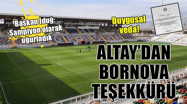 SONKALEİZMİR-Süper Lig'de cuma günü 20.00'de başlayacak Hatayspor maçı ile Alsancak Mustafa Denizli Stadı'na dönecek Altay, devler arenasına çıkmasında büyük pay sahibi olan Bornova Aziz Kocaoğlu'na duygusal bir mesajla veda etti. Kulüpten yapılan açıklamada, "Evimiz Alsancak Mustafa Denizli Stadı'nın özlemini hafiflettiren, tüm dinamikleriyle Süper Lig'e çıkmamızda büyük pay sahibi olan ve uğuruna her zaman inandığımız Bornova Aziz Kocaoğlu Stadı'na veda ediyoruz. Bornova Aziz Kocaoğlu Stadı'nda oynadığımız tüm zamanlarda yanımızda olan, bizlere misafir değil ev sahibi gibi hissettiren tüm Bornova halkına, Bornova Belediye Başkanı Sayın Dr. Mustafa İduğ'a, Bornova Belediyesi ve Bornova Aziz Kocaoğlu Stadyumu çalışanlarına sonsuz teşekkür ederiz" denildi.