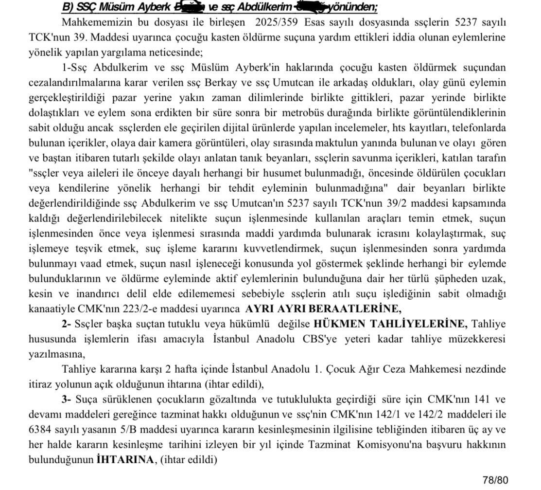 Sanıklar Abdülkerim ve Müslüm için “çocuğu kasten öldürmek suçuna yardım” suçlamasından ‘beraat’ kararı verilmesine gerekçe olarak “her türlü kuşkudan uzak ve mahkumiyete yeterli delil bulunmaması” gösterildi.