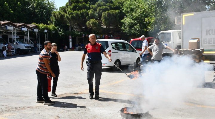 Eğitimde, Aydın Büyükşehir Belediyesi İtfaiye Daire Başkanlığı Eğitim Şube Amiri Ahmet Tanrıverdi, elektrik ve gaz kaçağından oluşabilecek yangın durumlarında yapılması gerekenler ve yangın söndürme ekipmanlarının kullanımı hakkında bilgi verdi.