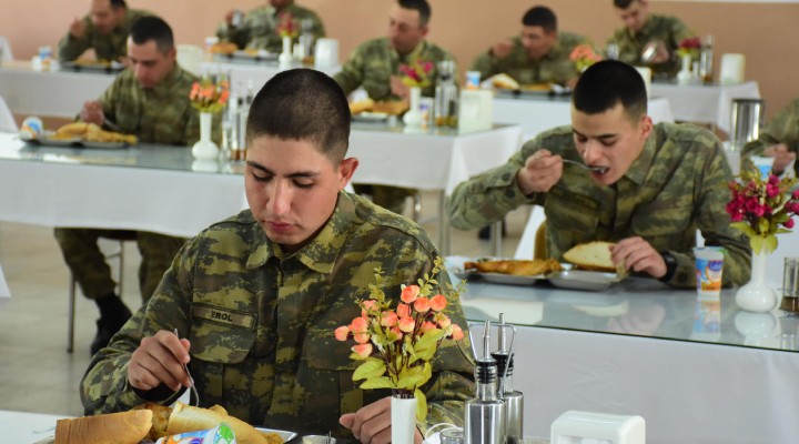 Yemekhaneye ise askerlerin ateşi ölçülerek içeri alınıyor. Sosyal mesafeyi korumak için her masada bir personel oturuyor. Yemek dağıtımı yapan personelin maske, eldiven ve bone takması titizlikle takip ediliyor. Yemek yemek için gelen personelin en az 20 saniye ellerini yıkaması sağlanıyor.