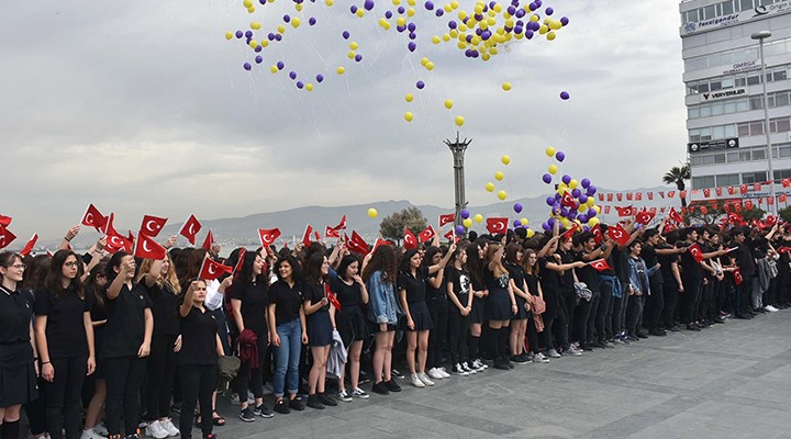 Alsancak Cumhuriyet Meydanı'nda toplanan öğretmen ve öğrencilerden oluşan grup, Atatürk Lisesi Marşı'nı okuduktan sonra gökyüzüne balonlar bıraktı.