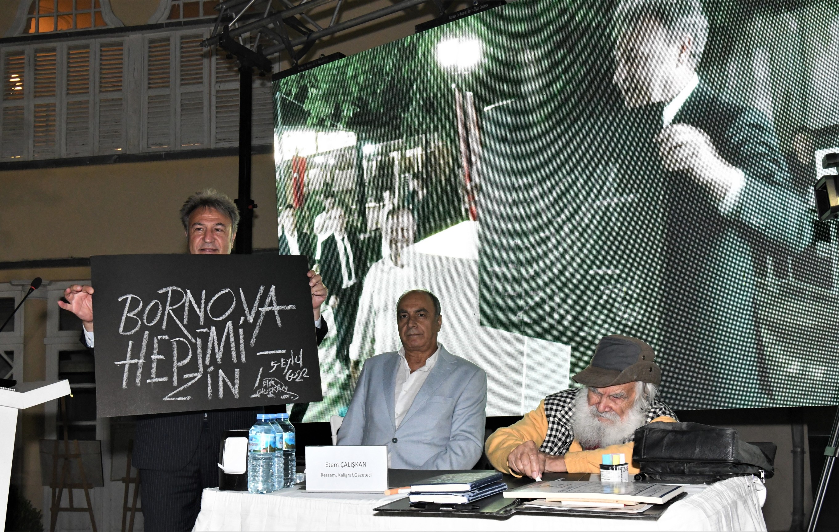 Bornova Kaymakamı Fatih Genel’in de katıldığı etkinlik Bornova Belediyesi Kent Arşivi ve Müzesi Dramalılar Köşkü’nde gerçekleşti. Etkinlikte ilk olarak ‘özgürlük’ teması ile çalışılan resim ve heykellerden oluşan ‘Zafer ve Kurtuluşun 100. Yılı Karma Sergisi’nin açılışı yapıldı. 18 eserinden yer aldığı sergiyi gezen Bornovalılar ardından Gazi Mustafa Kemal Atatürk'ün imzasını stilize eden ve Anıtkabir kitabelerini yazımında görev alan ünlü Türk hattat, gazeteci ve ressam Etem Çalışkan ile söyleşi gerçekleştirdi. 94 yaşındaki sanatçı katılımcılara 100. Yıl için hazırladığı gösteriyi de sundu.