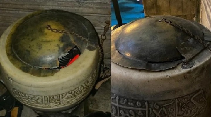 Ayasofya-i Kebir Camii’nde 500 yıllık imparatorluk kapısının tahrip edilmesinin ardından şimdi de Osmanlı zamanından kalma su haznesinin kapağı kırıldı ve içine ayakkabı konuldu.